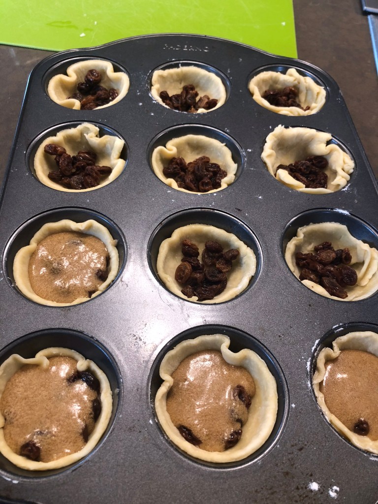 Soak raisins in boiled water for about 30 minutes. Roll out pastry and cut 4 inch circles to line muffin cups. Mix together butter, brown sugar, salt and corn syrup. Stir in egg and vanilla. Drain raisins and discard water. Distribute the raisins in the pastry lined muffin cups. Top with liquid mixture making sure not to overfill. Bake in preheated 400 degree oven for 15 minutes. Cool slightly and remove individual tarts to cooling rack.