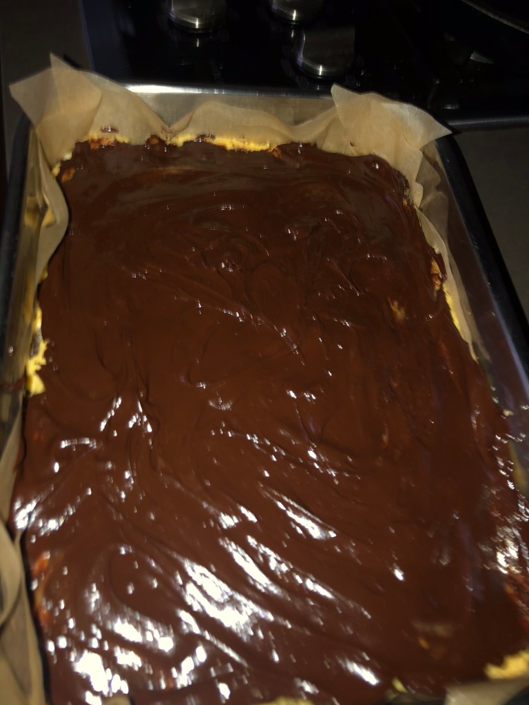 For the top layer melt chocolate and butter in a heat proof bowl over the simmering water. Stir until smooth and spread this mixture over the middle layer. Chill until firm.