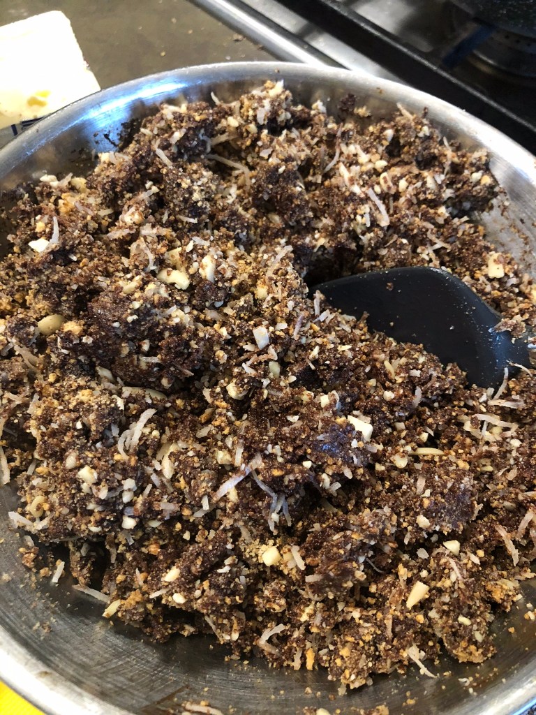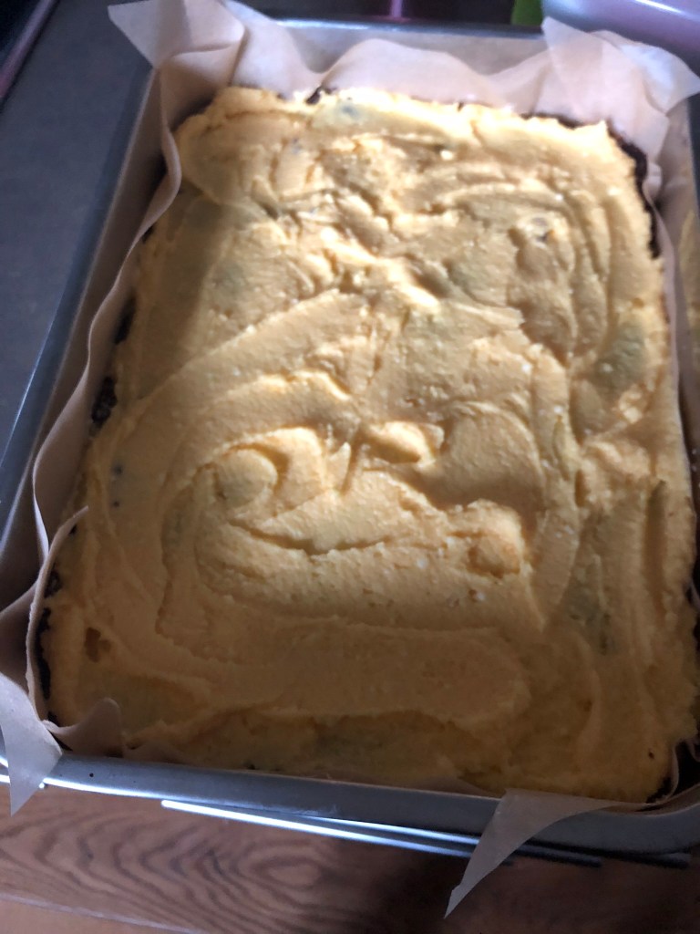 For the middle layer place butter, custard powder and cream into a bowl and mix until fluffy. Spread this mixture on the crumb base and put back into the freezer.